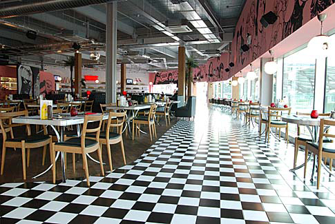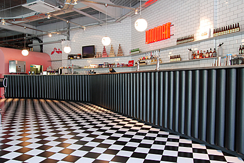 We installed approximately 400m2 of black & white tiling, curved walls to all areas, oak columns and an upholstered bar. | |||