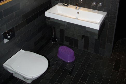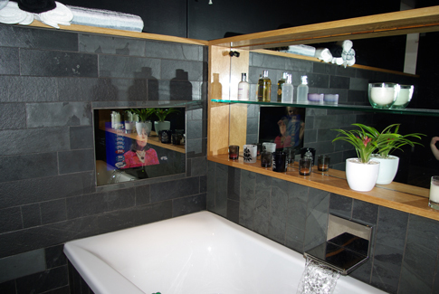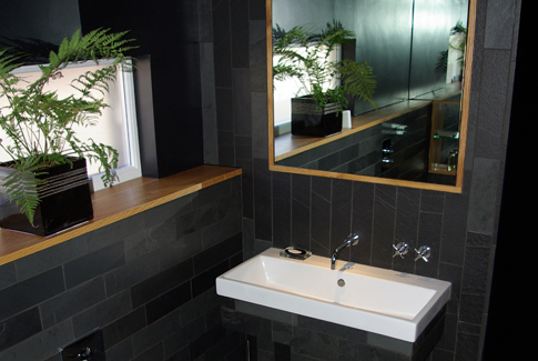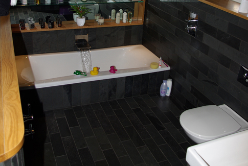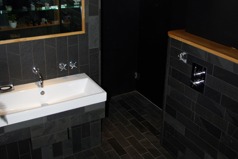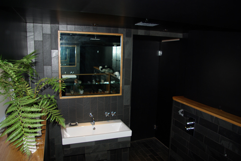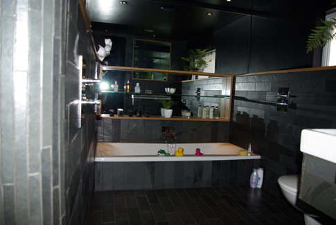 This bathroom has been tiled using a brazilian slate, with mirrors to both ends, a heated mirror on the cabinet over the sink, solid oak shelves and cabinets for a rich warm feel.